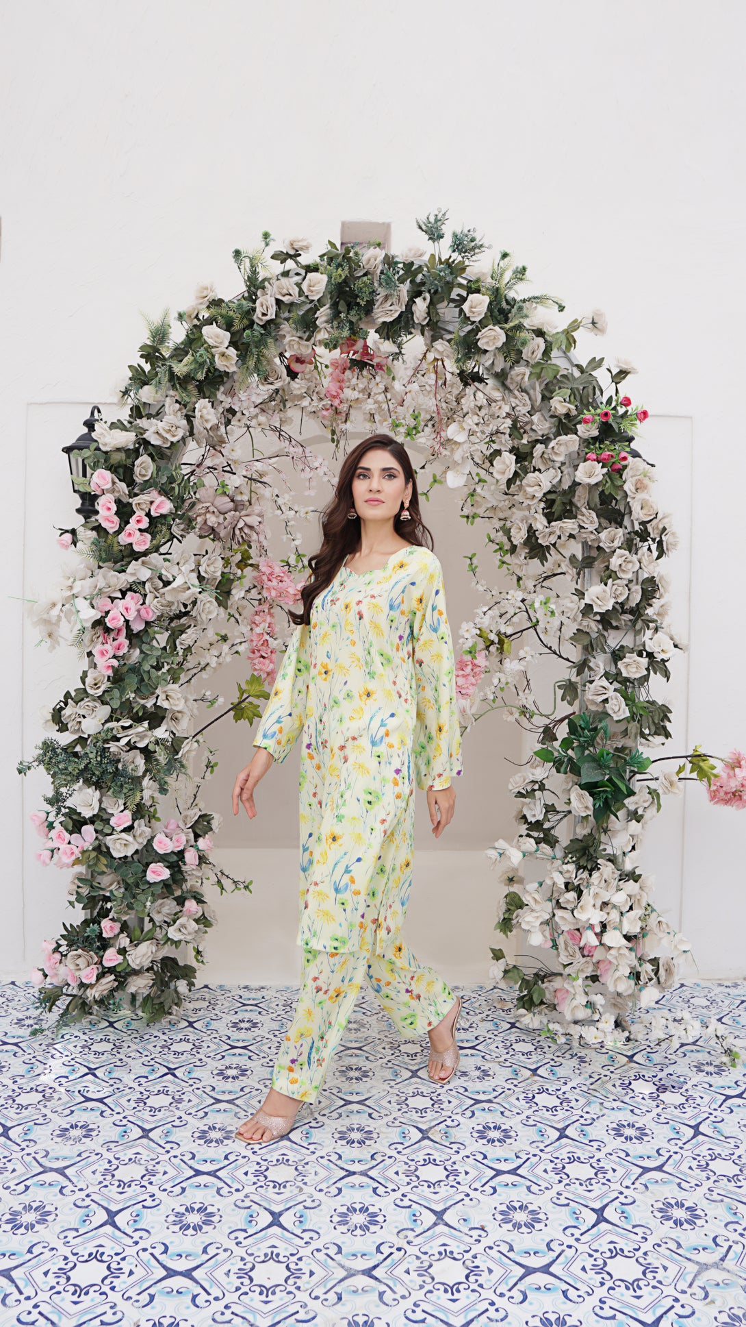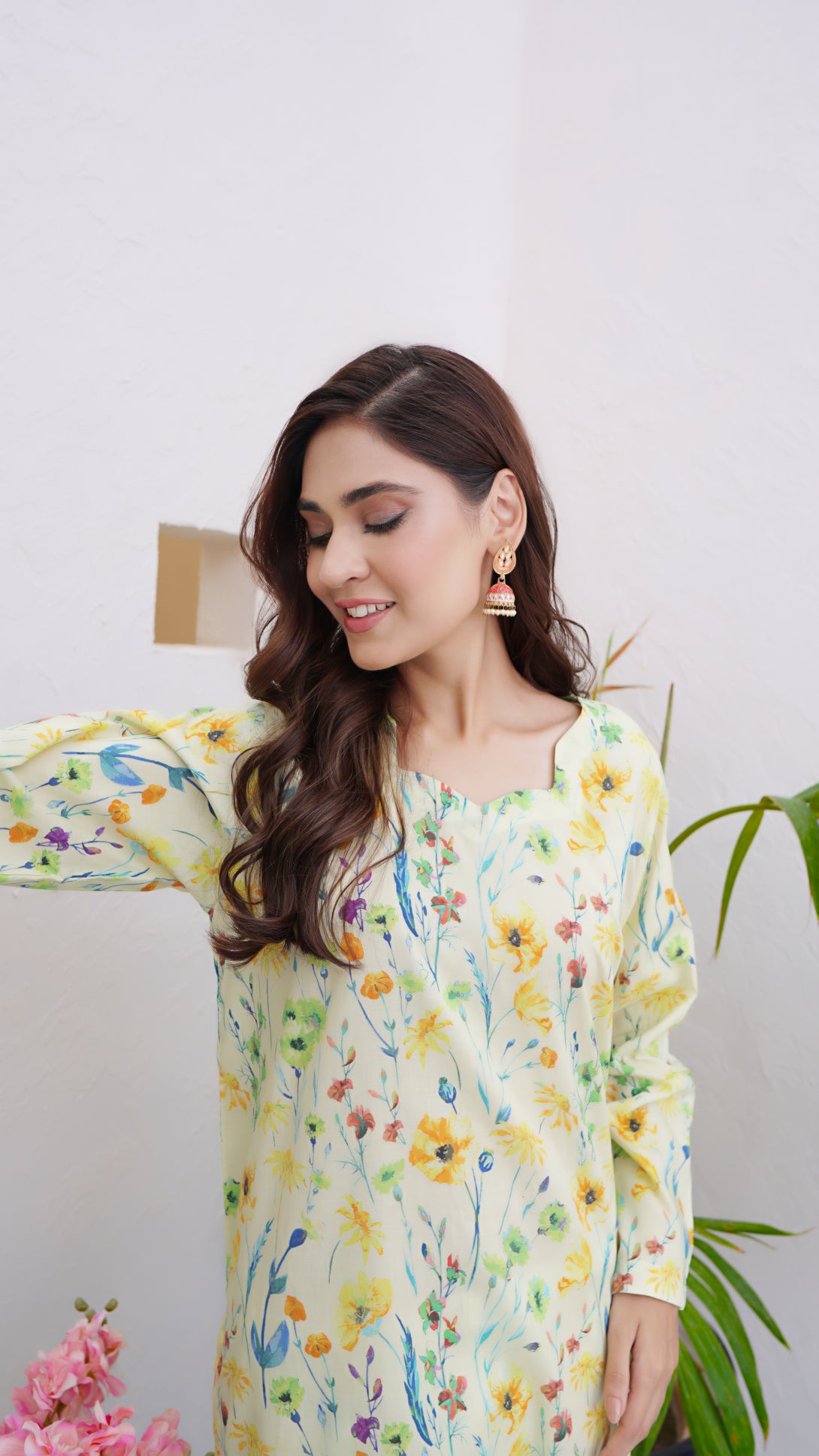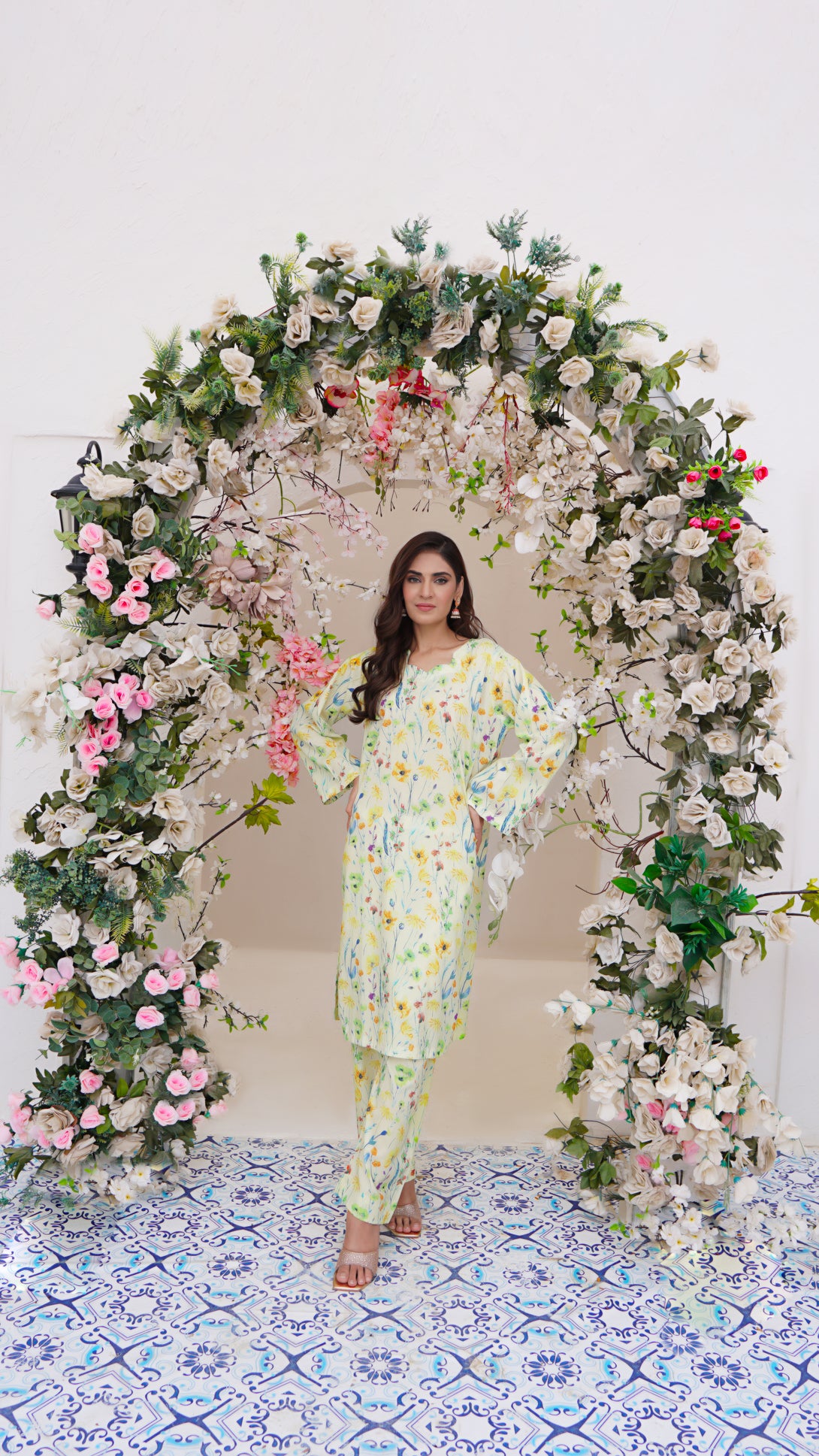 Embrace the season with this traditionally stylish stitched 2 piece cambric suit in with elegant lace work.. This elegant ensemble is paired with straight pants for a graceful look. Perfect for casual wear, it adds a touch of sophistication to your wardrobe.
