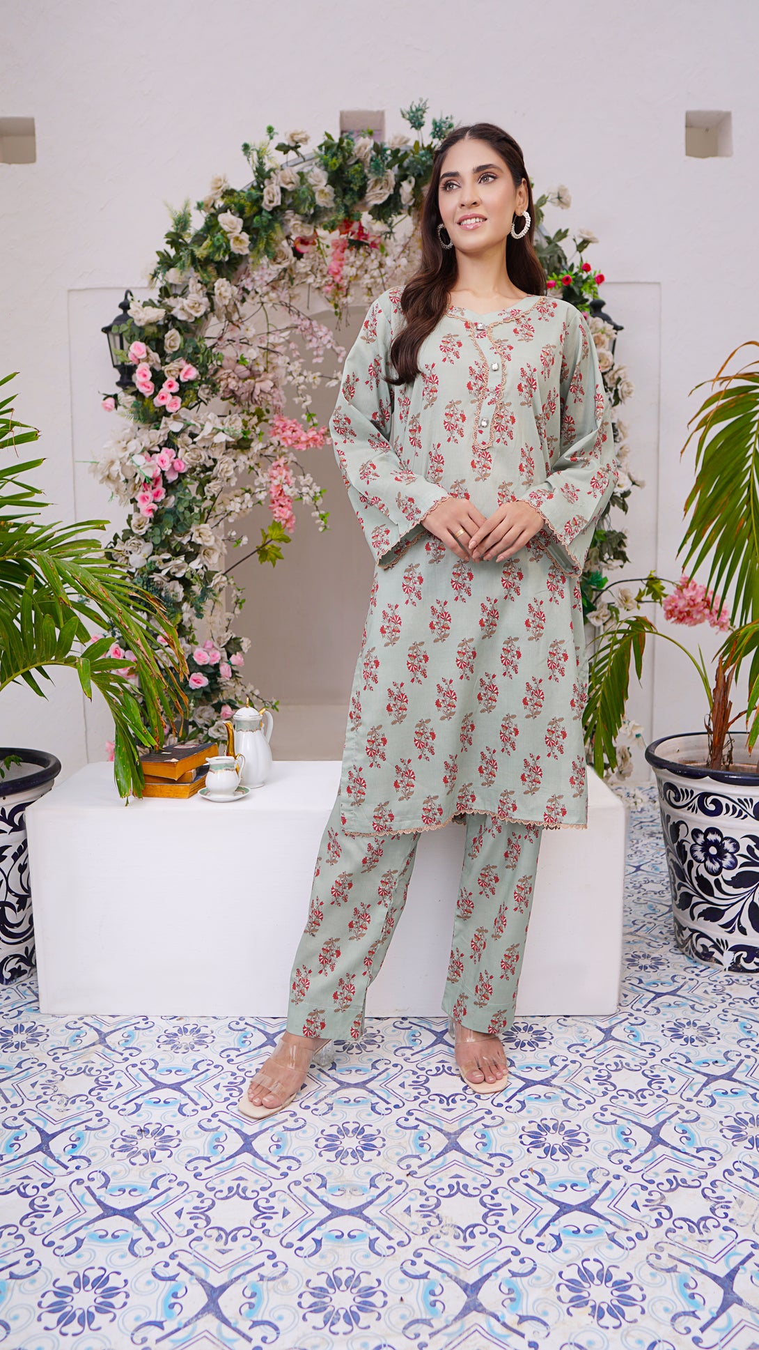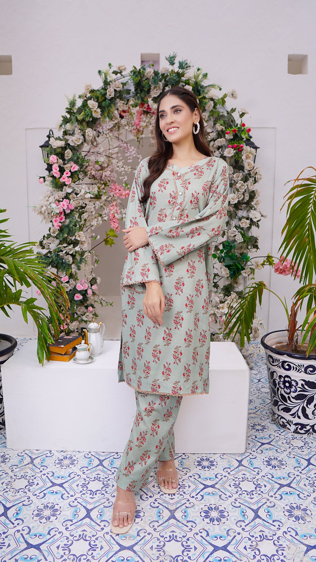 Embrace the season with this traditionally stylish stitched 2 piece cambric suit in with elegant lace work.. This elegant ensemble is paired with straight pants for a graceful look. Perfect for casual wear, it adds a touch of sophistication to your wardrobe.