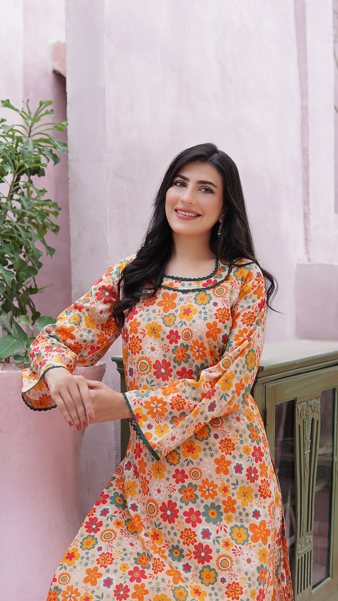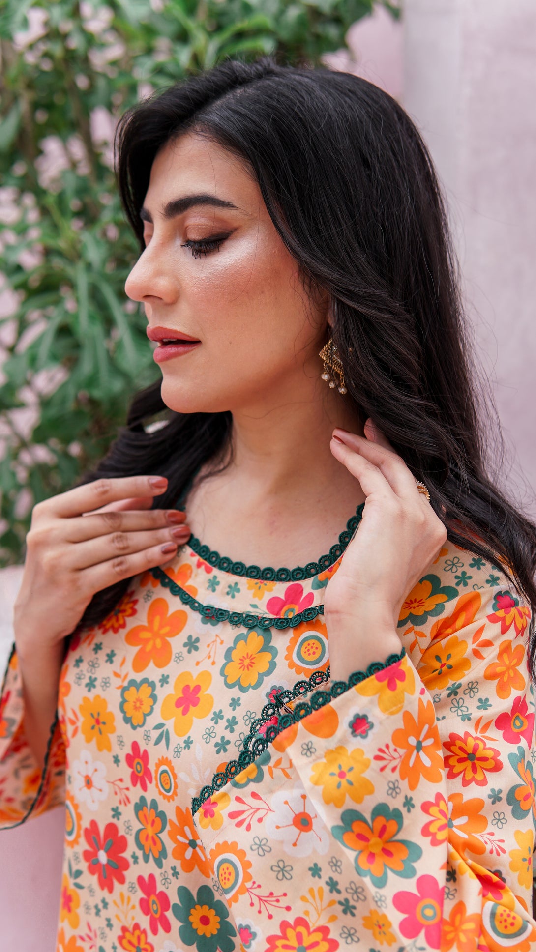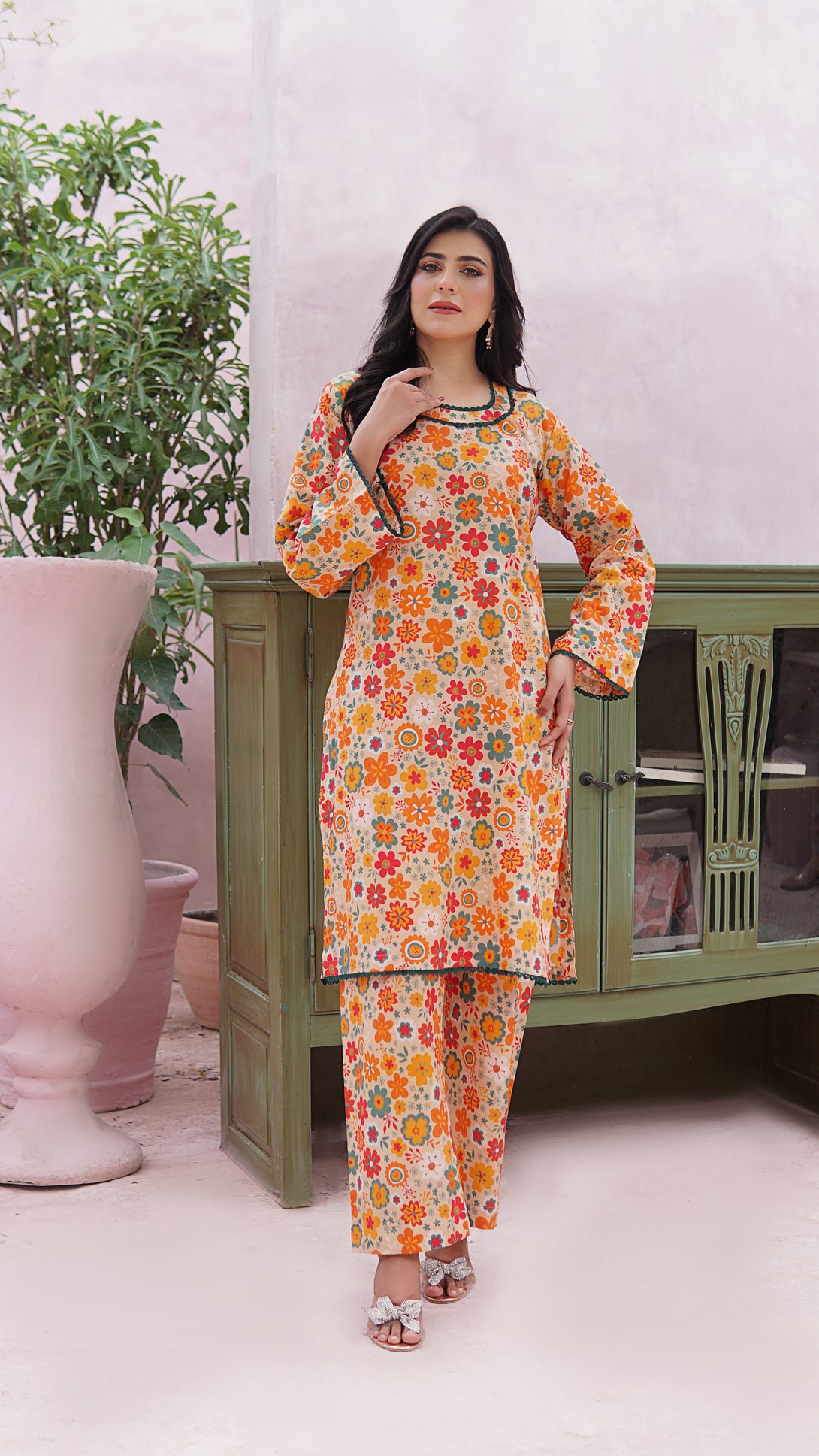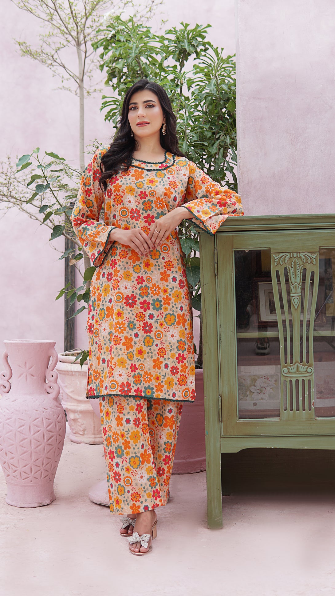 Embrace the season with this traditionally stylish stitched 2 piece cambric suit in with elegant lace work.. This elegant ensemble is paired with straight pants for a graceful look. Perfect for casual wear, it adds a touch of sophistication to your wardrobe.
